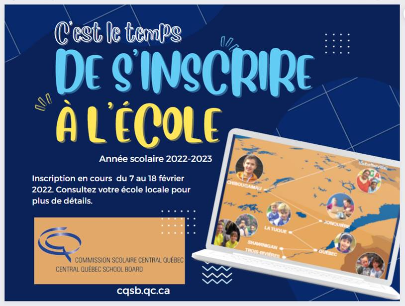 La période officielle d’inscription à l’école pour l’année scolaire 2026-2027 se tiendra du 2 au 13 février 2026. Les parents d’élèves qui fréquentent déjà une école de la commission scolaire Central Québec en 2025-2026 devront procéder à la réinscription de leur enfant en ligne, par le biais de la plateforme Mozaïk. Veuillez noter que la réinscription ne peut pas se faire à partir de l’application Clic école. Avant la fin du mois de janvier, les écoles feront parvenir davantage d’information aux parents par courriel. Les parents qui souhaitent inscrire leur enfant pour la première fois dans une école de la commission scolaire Central Québec devront se procurer les documents nécessaires en version papier auprès de l’école associée à leur territoire. Afin de connaître l’école associée à votre territoire, veuillez utiliser l’outil « Trouver votre école » disponible dans l’onglet du même nom sur le site Web de la commission scolaire. Pour obtenir plus d’information au sujet de l’inscription à l’école, veuillez consulter la section « Inscriptions » qui se trouve dans l’onglet « Renseignements aux parents ».