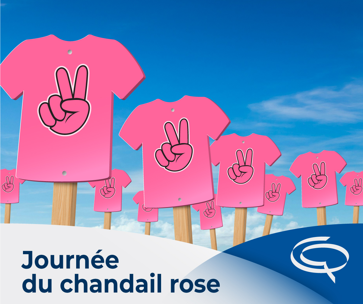 Nous avons à cœur le bien-être physique et mental de tous nos élèves et de notre personnel. La lutte contre l'intimidation est une préoccupation de tous les jours et c'est pourquoi le 22 février 2023, vous êtes tous invités à participer à la Journée du chandail rose. Cette journée de sensibilisation est l'occasion de nous rappeler que la gentillesse, la courtoisie, l’empathie, le respect et les sourires contribuent grandement à rendre nos milieux plus inclusifs, sécuritaires et bienveillants. Ce mercredi, et tous les jours de l’année, soutenons-nous les uns les autres.