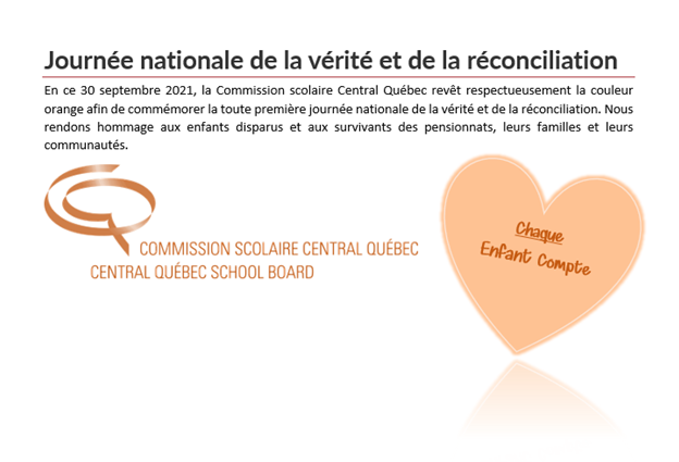 La Commission scolaire Central Québec revêt respectueusement la couleur orange afin de commémorer la toute première journée nationale de la vérité et de la réconciliation. Nous rendons hommage aux enfants disparus et aux survivants des pensionnats, leurs familles et leurs communautés.