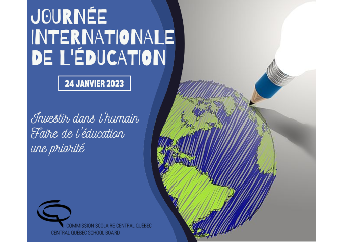 En ce 24 janvier, la Commission scolaire Central Québec (CSCQ) souligne la Journée internationale de l’éducation. Notre raison d'être, comme commission scolaire, est de fournir la meilleure éducation possible à tous nos élèves afin de leur permettre un futur des plus brillant. Le thème de cette année « investir dans l’humain, faire de l’éducation une priorité » fait partie intégrante des valeurs fondamentales qui sont au cœur de notre commission scolaire.