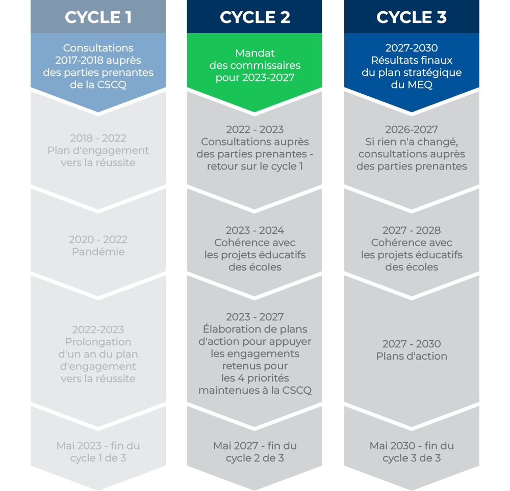 En phase avec le Plan stratégique et la Politique de la réussite éducative du ministère de l’Éducation (MEQ), notre PEVR se décline en trois cycles successifs.