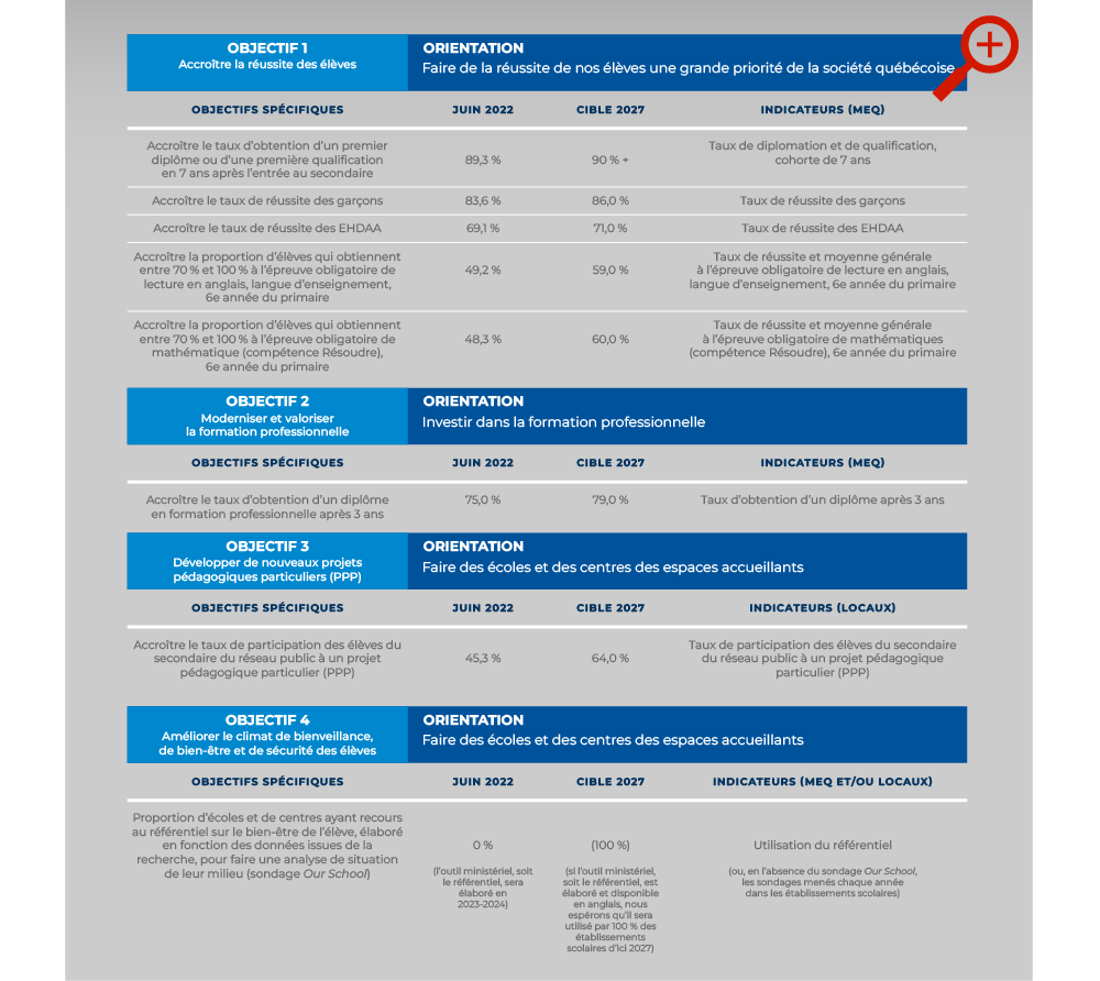 La Commission scolaire axera ses interventions pour accroître la réussite ainsi que les taux de qualification et de diplomation de ses élèves, interventions appuyées par les orientations, objectifs, points de référence et cibles du Ministère. Nous avons l’intention de cibler ces priorités en y associant des plans d’action chaque année.