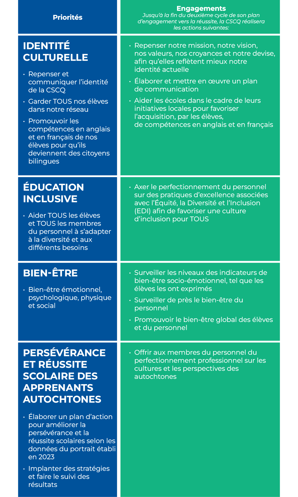Cible des domaines d’amélioration de la réussite éducative propres à la CSCQ en conformité avec nos quatre priorités
