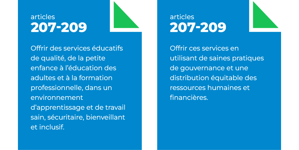 En conformité avec le mandat décrit aux articles 207 à 209 de la Loi sur l’instruction publique, la CSCQ s’engage à :