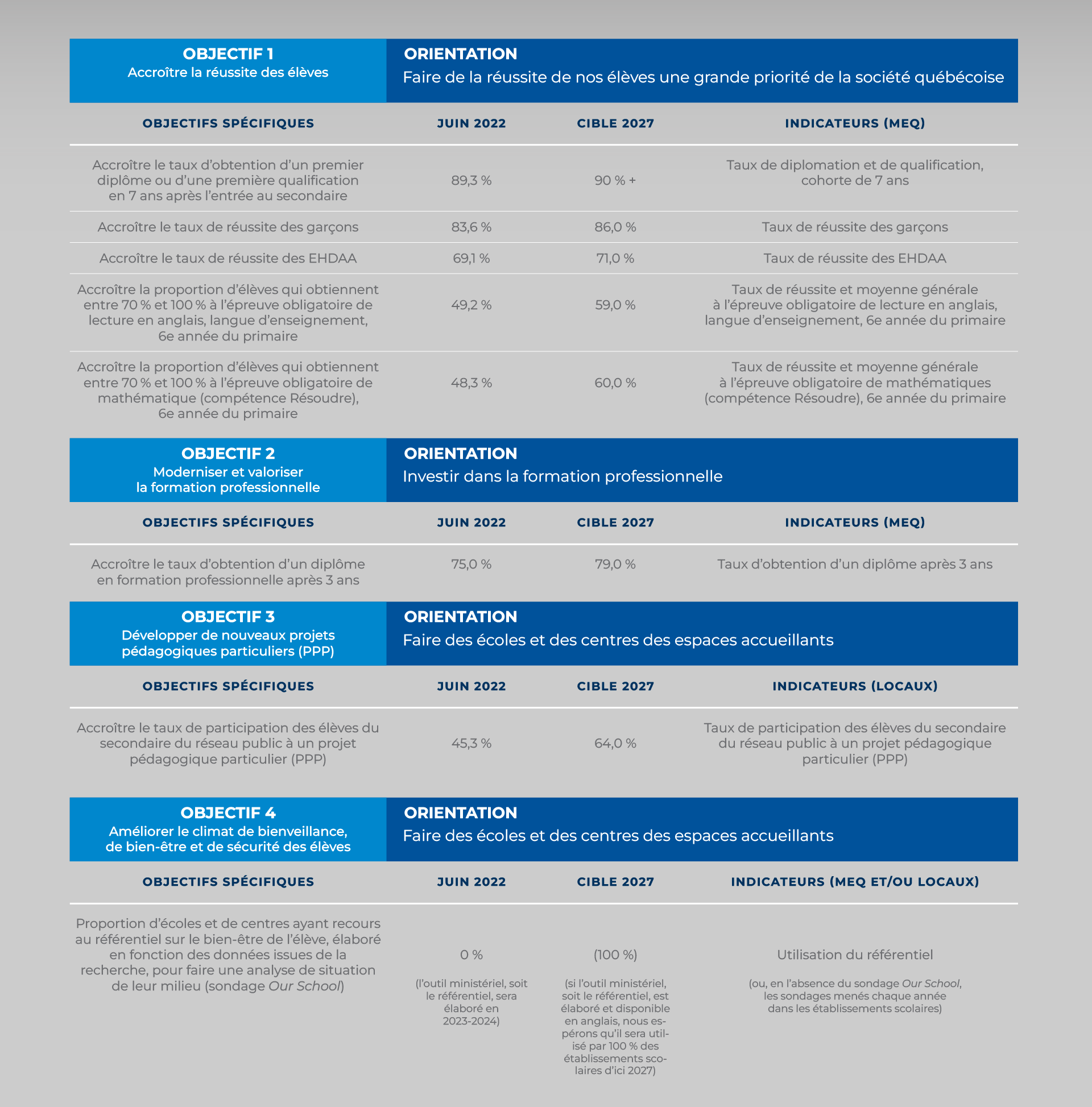 Ces plans d’action appuieront à leur tour l’amélioration continue de nos pratiques pédagogiques et socio-émotionnelles, ainsi que de nos pratiques organisationnelles et administratives, qui sont axées sur les données et conformes au mandat du Ministère d’utiliser des pratiques axées sur les données probantes dans toutes les commissions scolaires et centres de services scolaires.